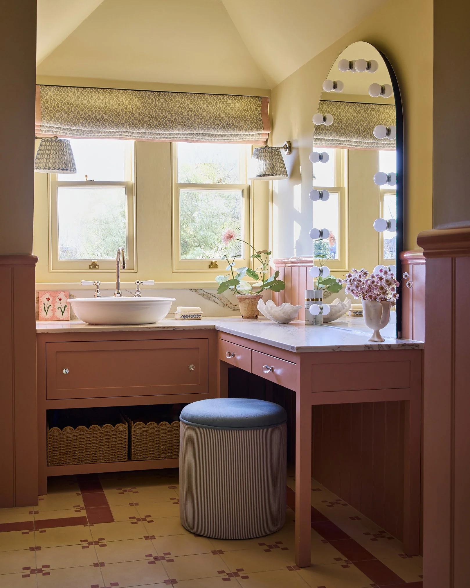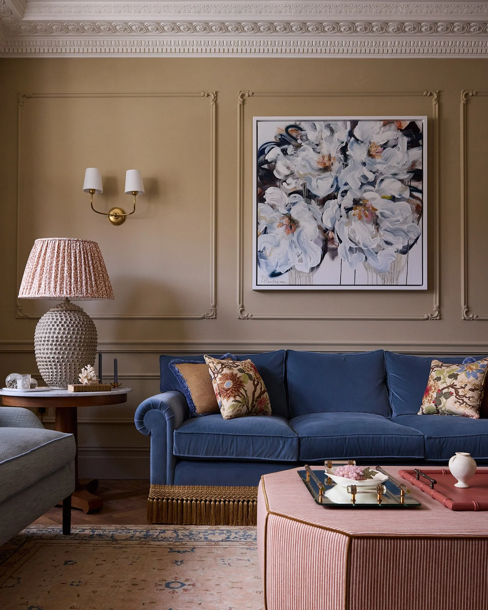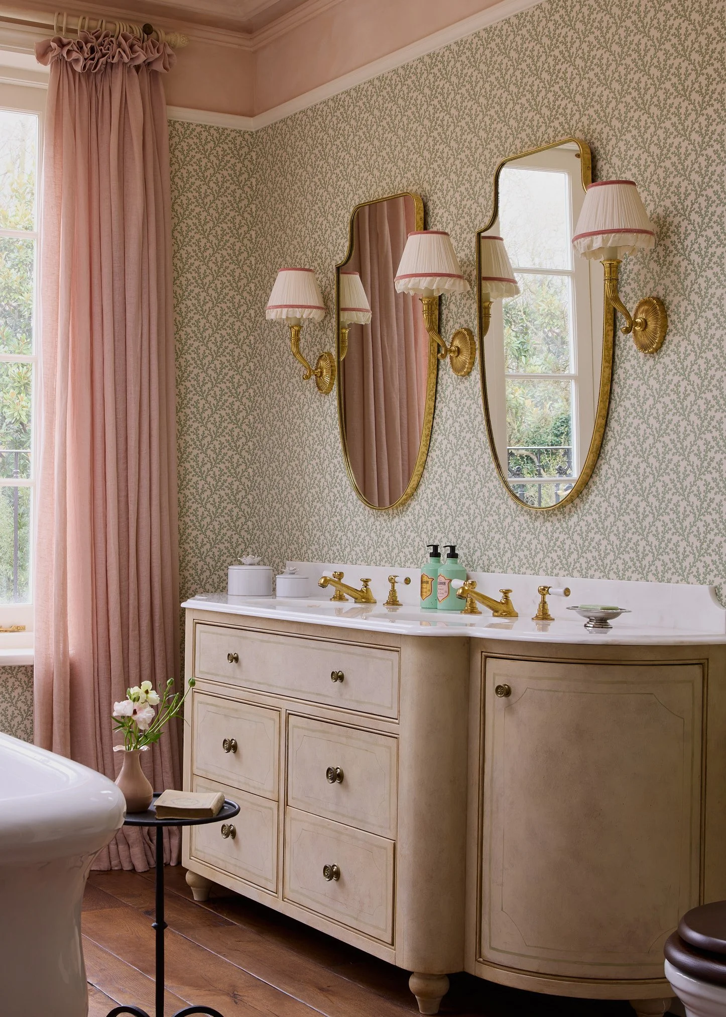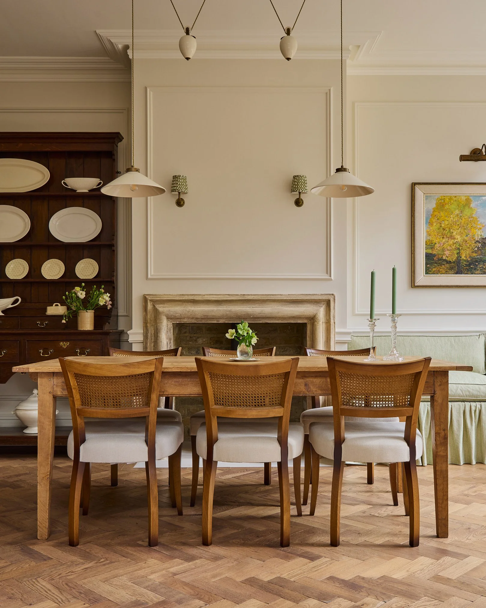 The kitchen and dining room is neutral, light and calm, which contrasts with the rest of the house with the patterned wallpaper and patterns throughout.
