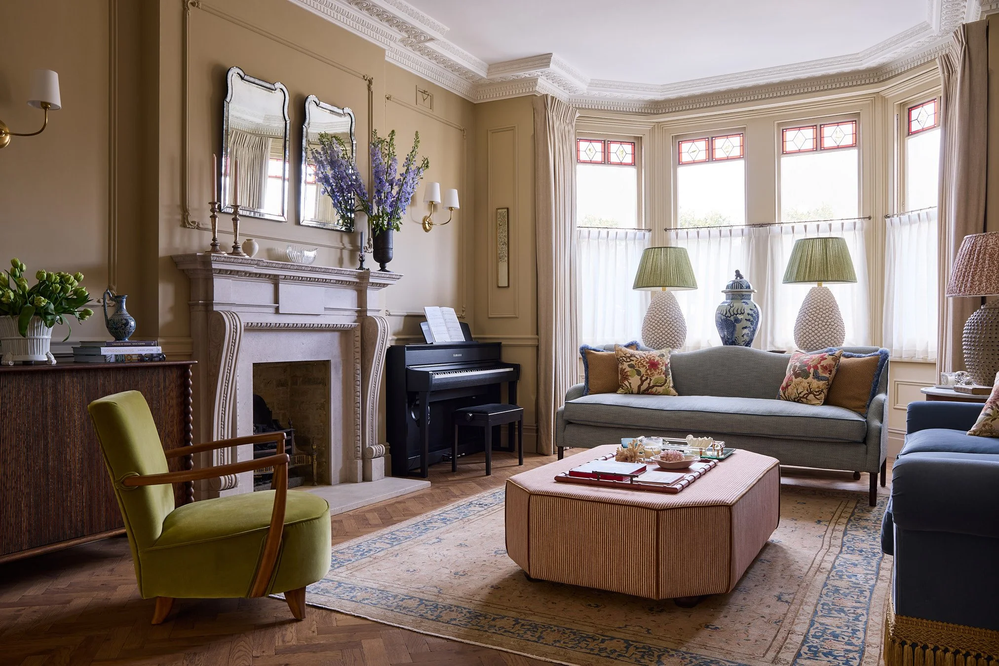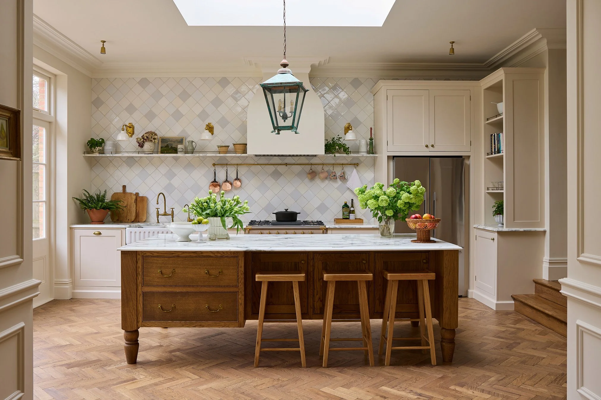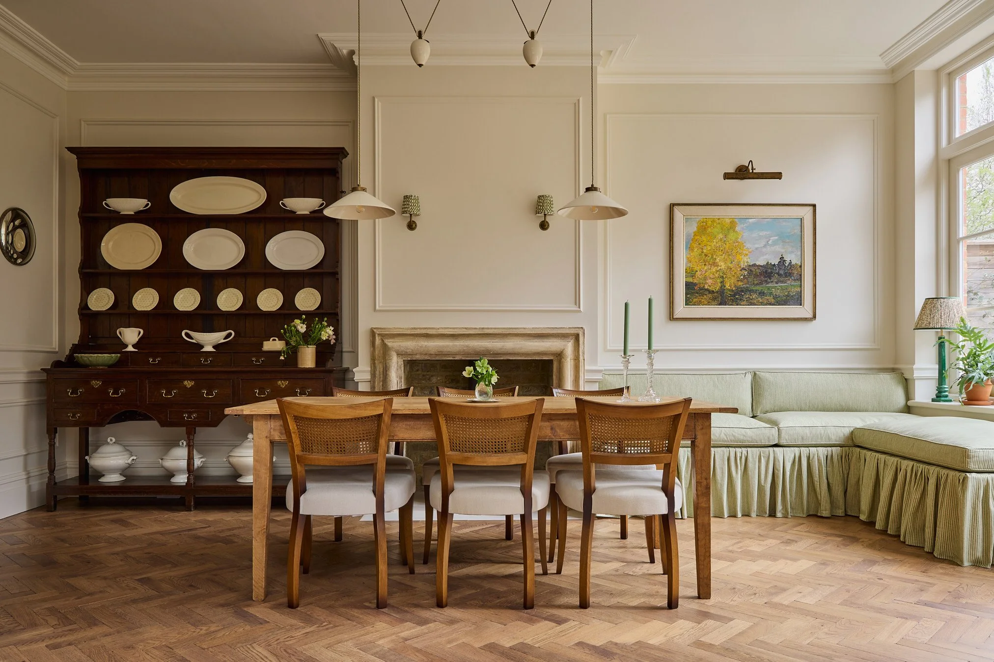 The house still had many original features and period charm and we designed with the aim of enhancing this at the heart of all proposals. We added a large full-width rear extension to the ground floor, in order to create an open-plan but visually distinct kitchen and dining area, built using traditional brick detailing to match the existing house. A feature lantern roof light allows lots of natural light into the kitchen area and the doors and windows to the rear elevation were carefully detailed to match the existing doors and windows exactly - but upgraded to current standards. The mature rear garden creates a beautiful focal point from the kitchen/dining area and a banquette seating area around the dining table allows these views to be fully enjoyed. A new log burner was installed to the dining room and the brick reveals were aged by the Contractor to make it look like the fireplace had always been there. Aged oak parquet flooring was fitted throughout the space and the kitchen, which included a bespoke oak island in the style of a free-standing antique piece of furniture was designed by Laura Stephens and made by Grovecourt Joinery.